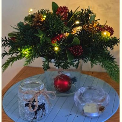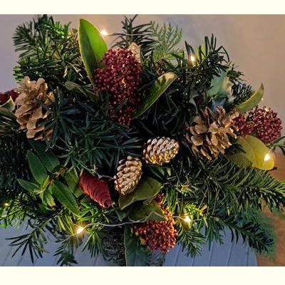 Het arrangement wordt extra feestelijk verlicht door fairy-lights.